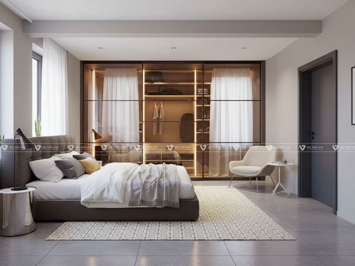 Kết hợp phần kính cường lực bao quanh tủ quần áo vừa điều chỉnh lượng ánh sáng trong phòng, vừa mang đến không gian vẻ đẹp lung linh, huyền ảo.