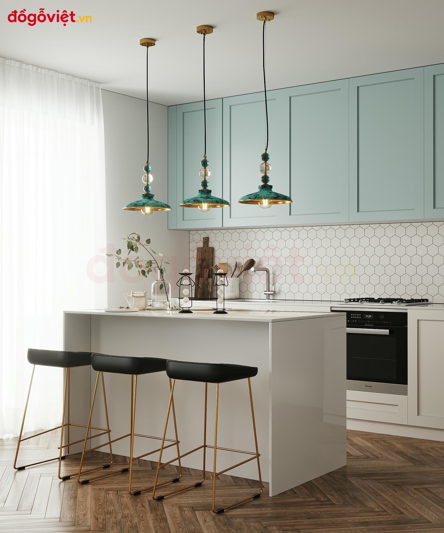 Tủ bếp kết hợp bàn đảo nhỏ là kiểu dáng mẫu tủ bếp đơn giản mà thông minh. Có thể dùng được để làm quầy bar hoặc bàn ăn sáng, gia tăng tiện ích sử dụng mà vẫn đảm bảo gọn gàng.
