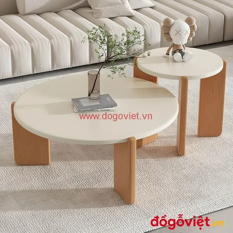 Bàn trà tròn đôi bằng gỗ sở hữu thiết kế hiện đại theo xu hướng trẻ trung. Chiếc bàn này được kết hợp từ bàn trà to và bàn trà nhỏ. Thiết kế dạng tách rời để tận dụng không gian. Hoặc trong thiết kế có sự lồng ghép với nhau đầy độc đáo.