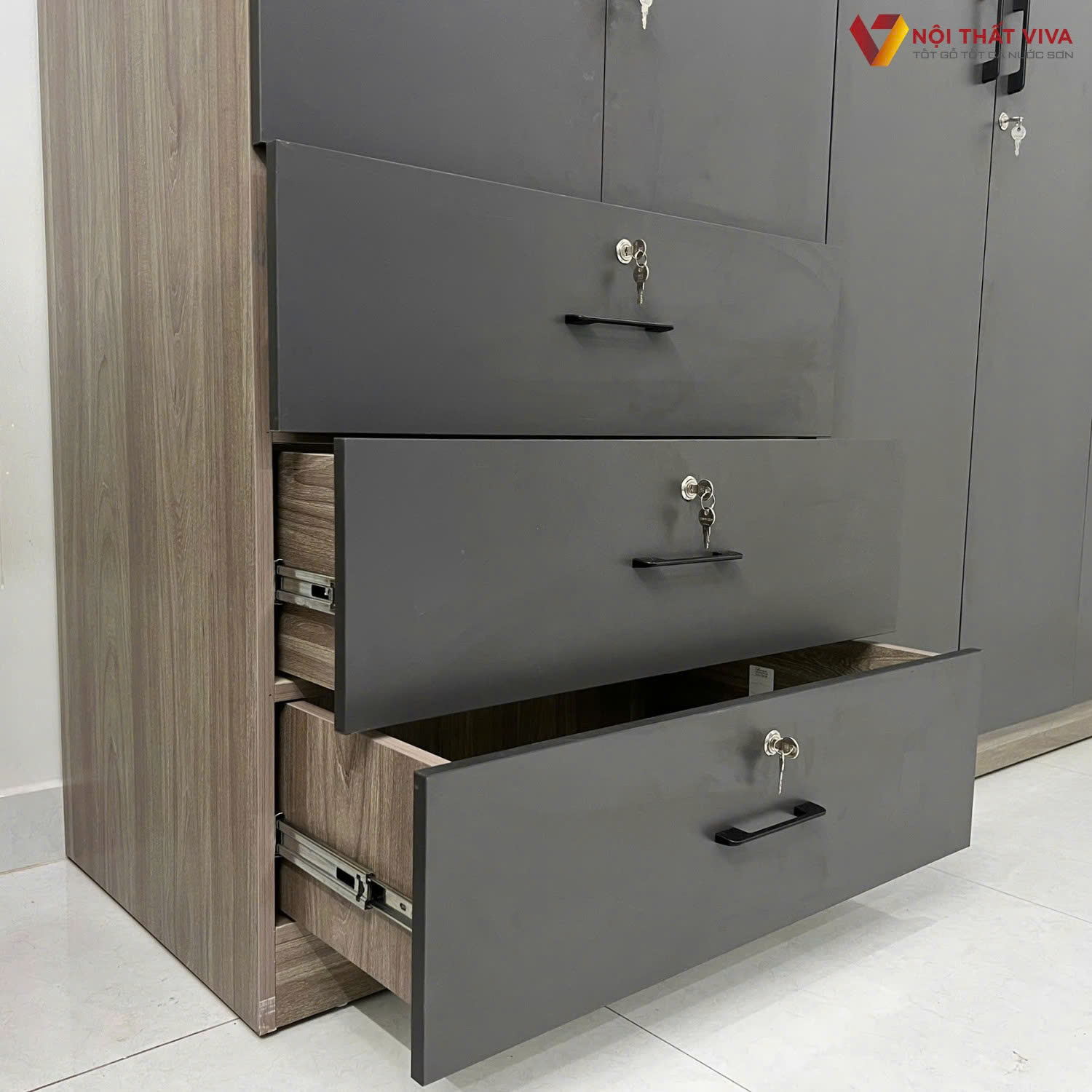 Theo tiêu chuẩn sản xuất Thùng + Cánh gỗ MDF tiêu chuẩn dày 17mm. Bề mặt kết hợp lớp phủ Melamine 2 mặt dày 5mm