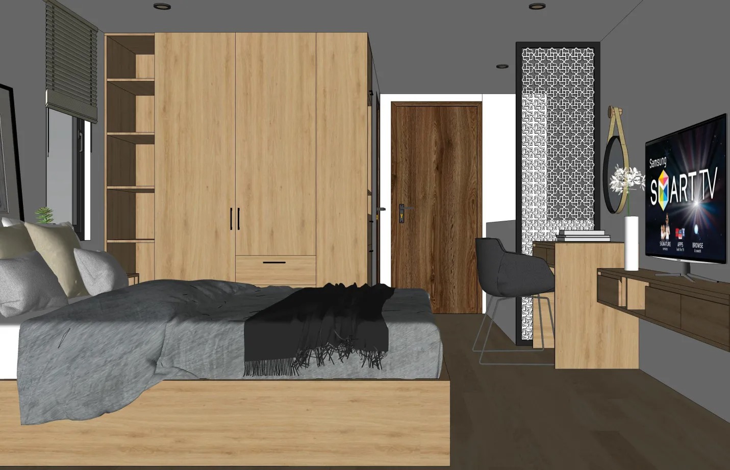 Lựa chọn mẫu tủ quần áo hiện đại đẹp màu xám sẽ giúp tổng thể căn phòng trở nên trầm tĩnh. Bên cạnh đó, đây còn là tông màu dễ phối hợp cùng những gam màu khác như đen, trắng, nâu hoặc vân gỗ.
