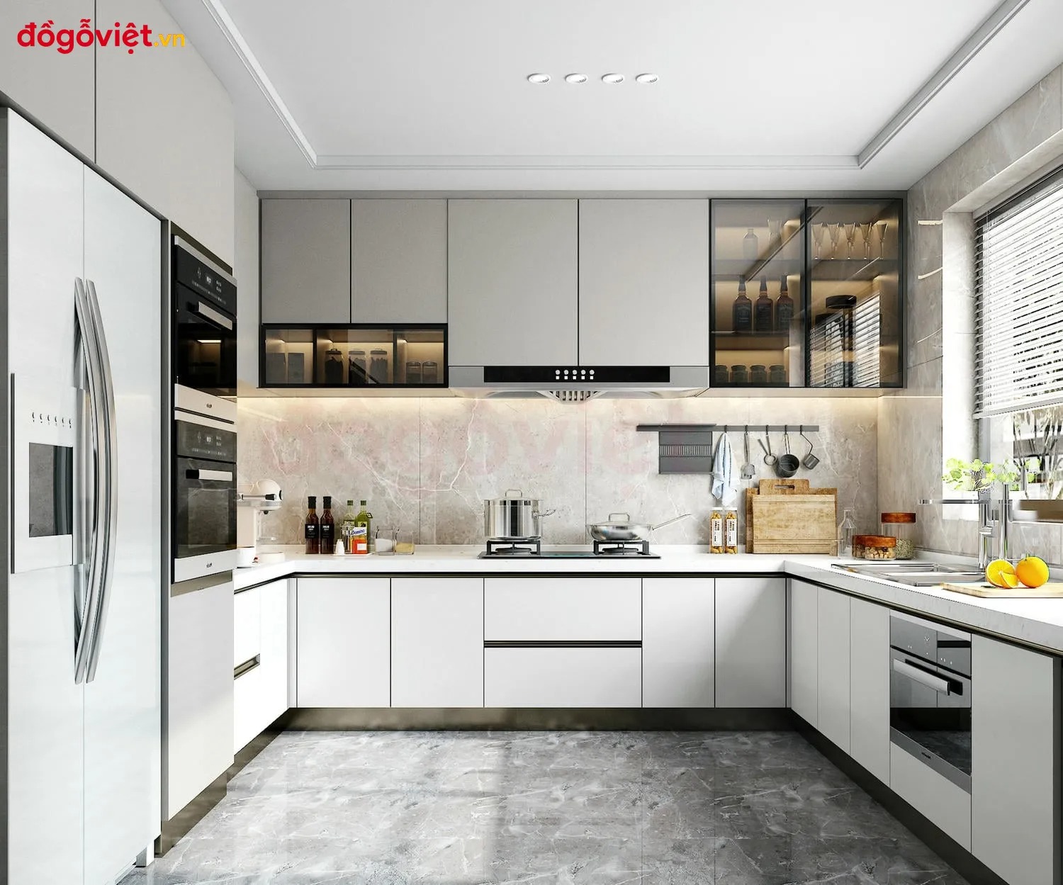 Sử dụng bề mặt phủ sẽ giúp gia tăng tính thẩm mỹ cho tủ bếp.