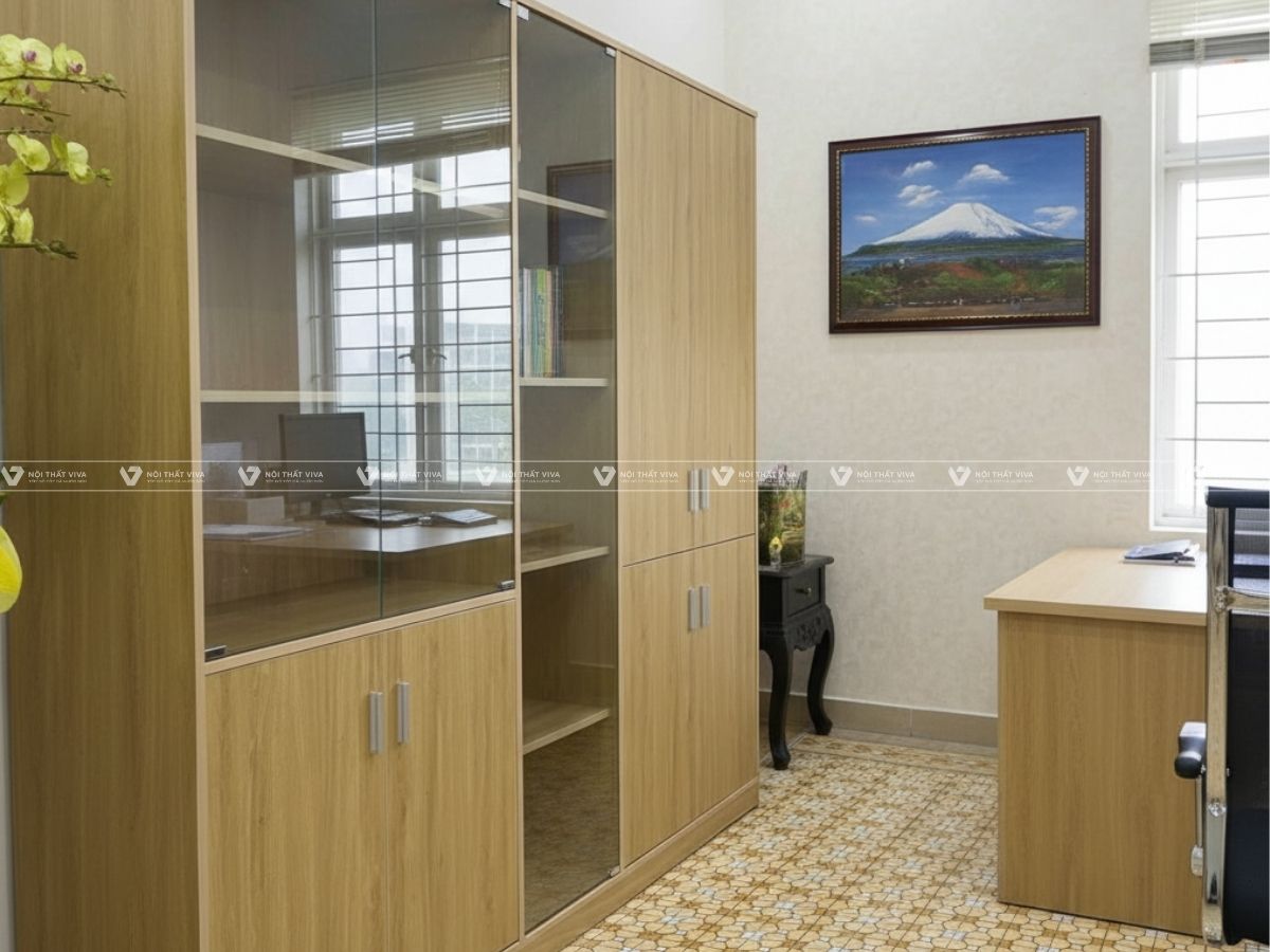 Với văn phòng lớn, để tối ưu lưu trữ, có thể chọn tủ nhiều ngăn, 4 cánh hoặc tủ âm tường.