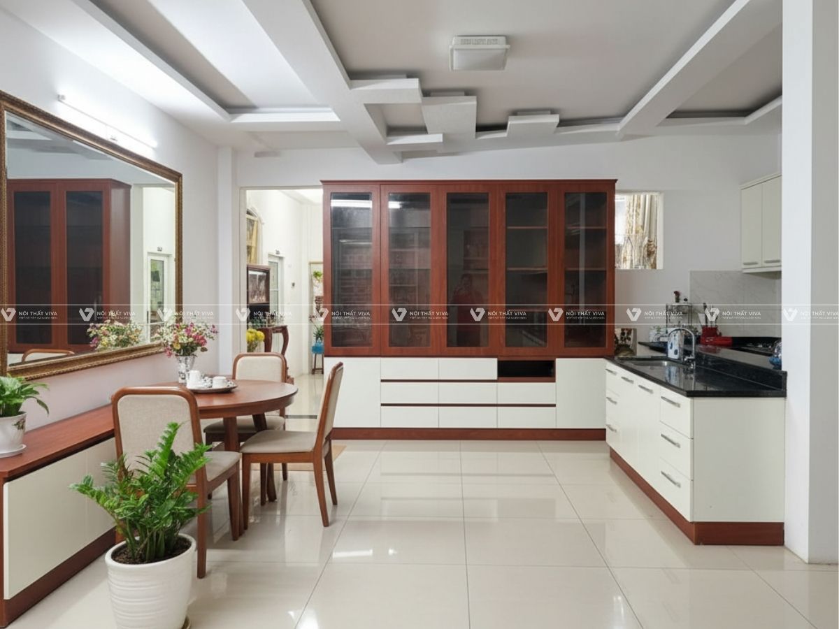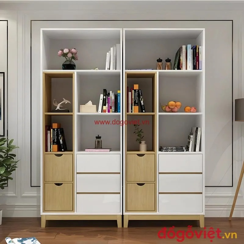 Kết hợp khung gỗ MDF phủ melamine trắng sáng, phối cùng cánh kính trong suốt. Sẽ mang lại được sự thanh thoát, sạch sẽ.