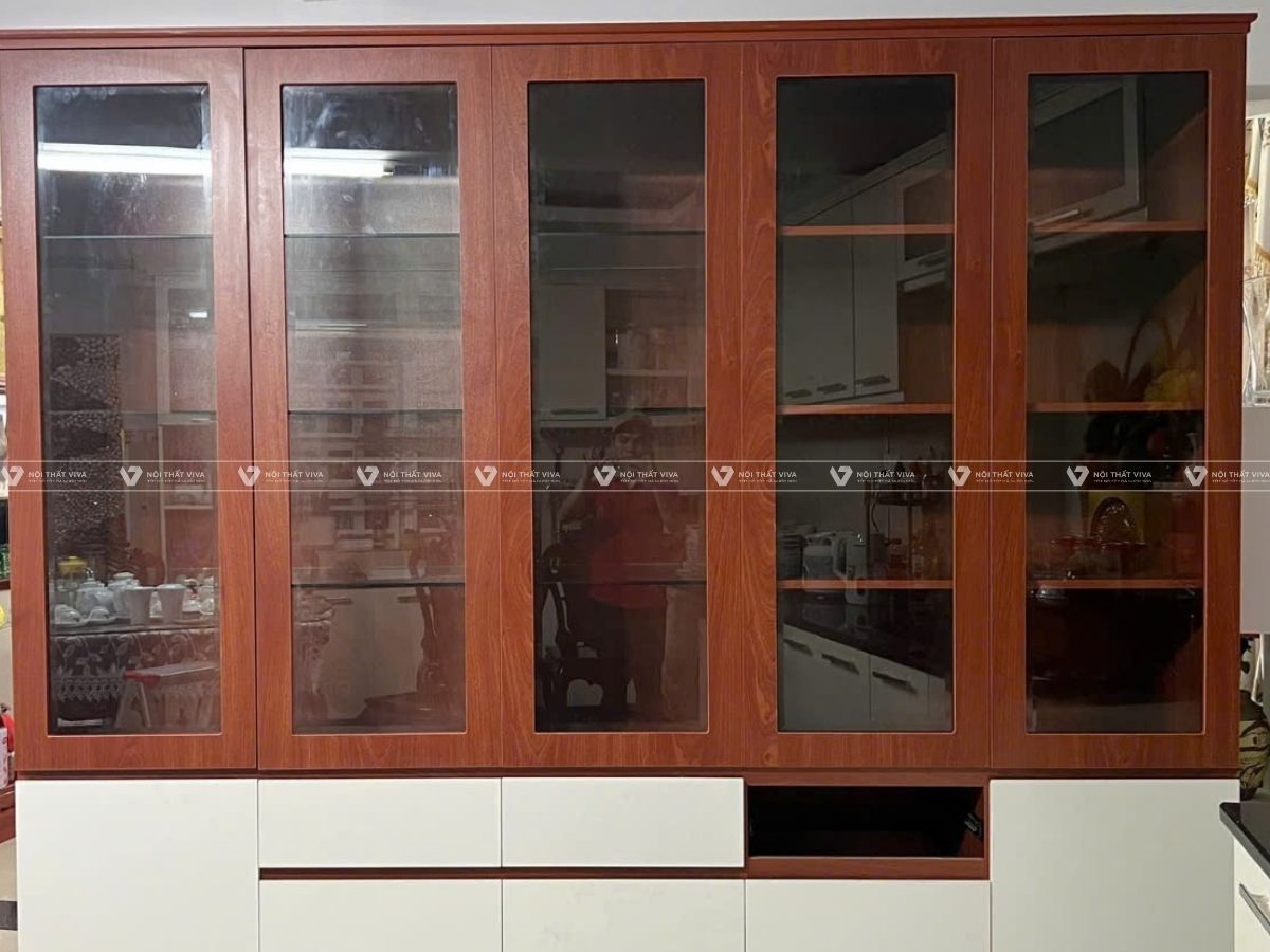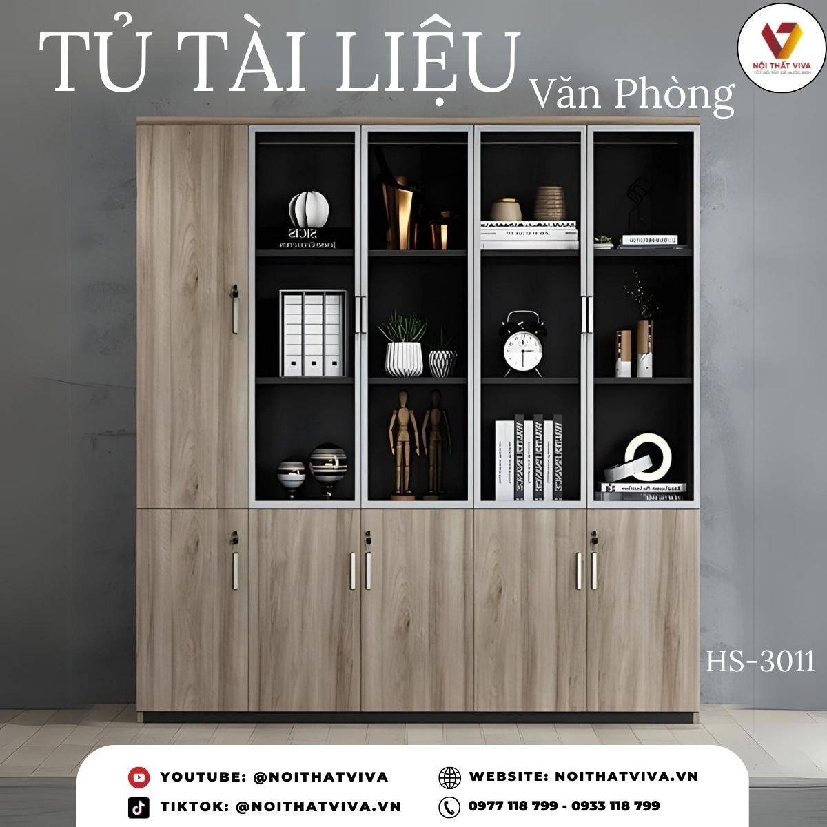 Thiết kế mẫu tủ phân chia ra thành hai tầng: tầng trên cánh kính dùng để trưng bày hồ sơ, tài liệu hoặc cúp lưu niệm. Còn tầng dưới là cánh gỗ kín dùng để cất giữ giấy tờ quan trọng.