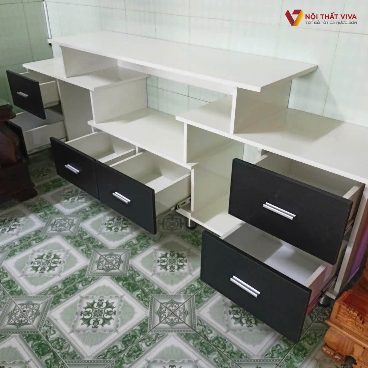 Thiết kế các mẫu tủ tivi gỗ công nghiệp giá rẻ, được tích hợp ngăn kéo chứa đồ. Kết hợp ngăn kéo trượt nhanh. Dùng để cất gọn những món đồ nhỏ trong nhà. Màu sắc tủ kệ tivi gỗ công nghiệp tươi tắn, thiết kế theo dạng tủ mở đóng hoặc tủ kéo.