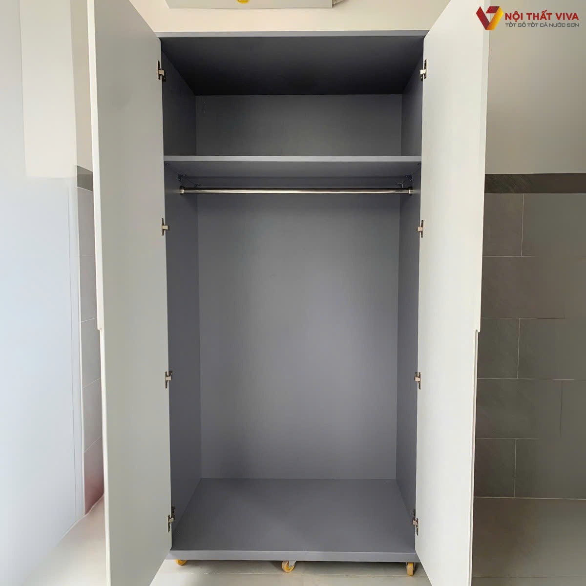 - Tủ quần áo MDF cánh mở: Mang lại cảm giác thoáng rộng cho căn phòng.