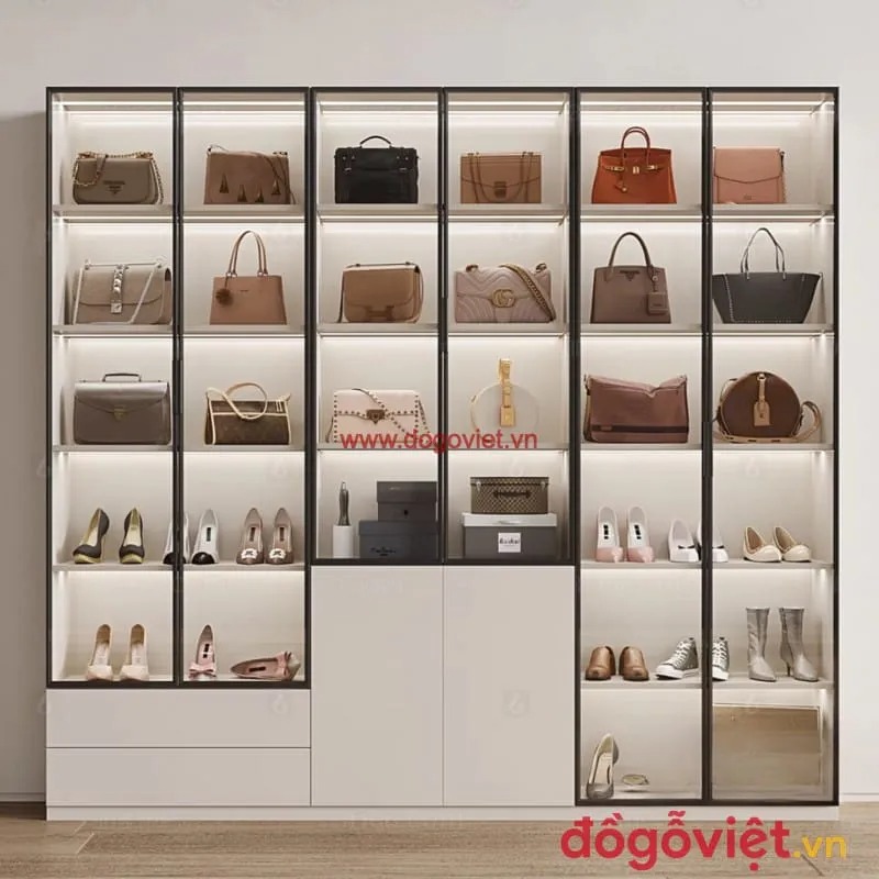 Đồng thời với chức năng là cất giữ, bảo quản giày dép. Phần kệ tủ giày còn tận dụng được để làm nơi trưng bày túi xách, mũ nón,...