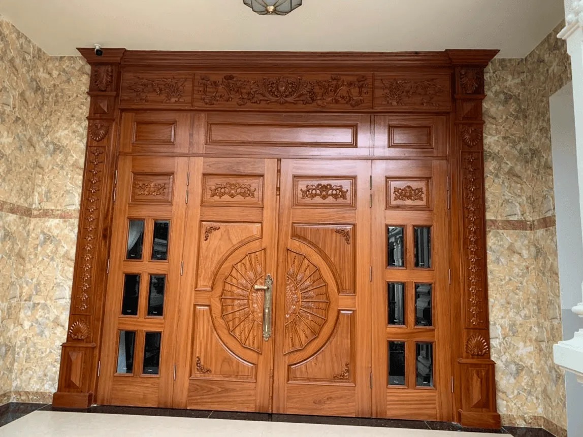 - Cửa gỗ cổ điển chạm khắc hoa văn tinh tế, tạo vẻ sang trọng và đẳng cấp cho không gian.