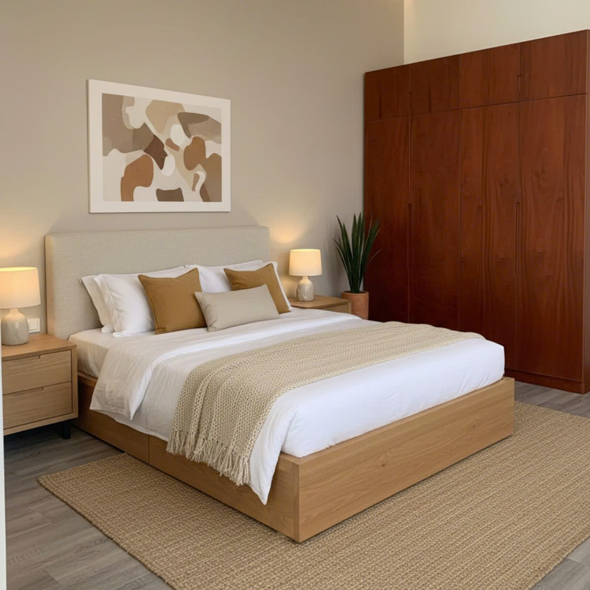 - Vân gỗ sáng màu cùng màu với màu tường. Nhằm đem đến sự liền mạch và không gian phòng rộng rãi.
