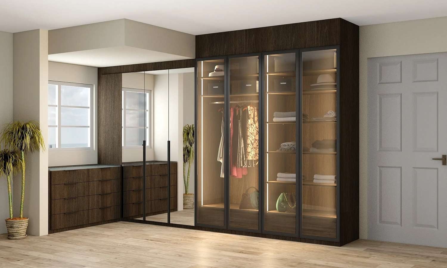 Tích hợp hệ đèn LED nhằm tạo hiệu ứng tương phản, làm bừng sáng căn phòng. Giúp tăng thêm vẻ đẹp, sự nổi bật của những bộ quần áo, túi xách, phụ kiện.... Có thể lựa chọn mẫu tủ quần áo cửa kính lùa linh hoạt, cửa kính mở truyền thống hay không cánh đều được.
