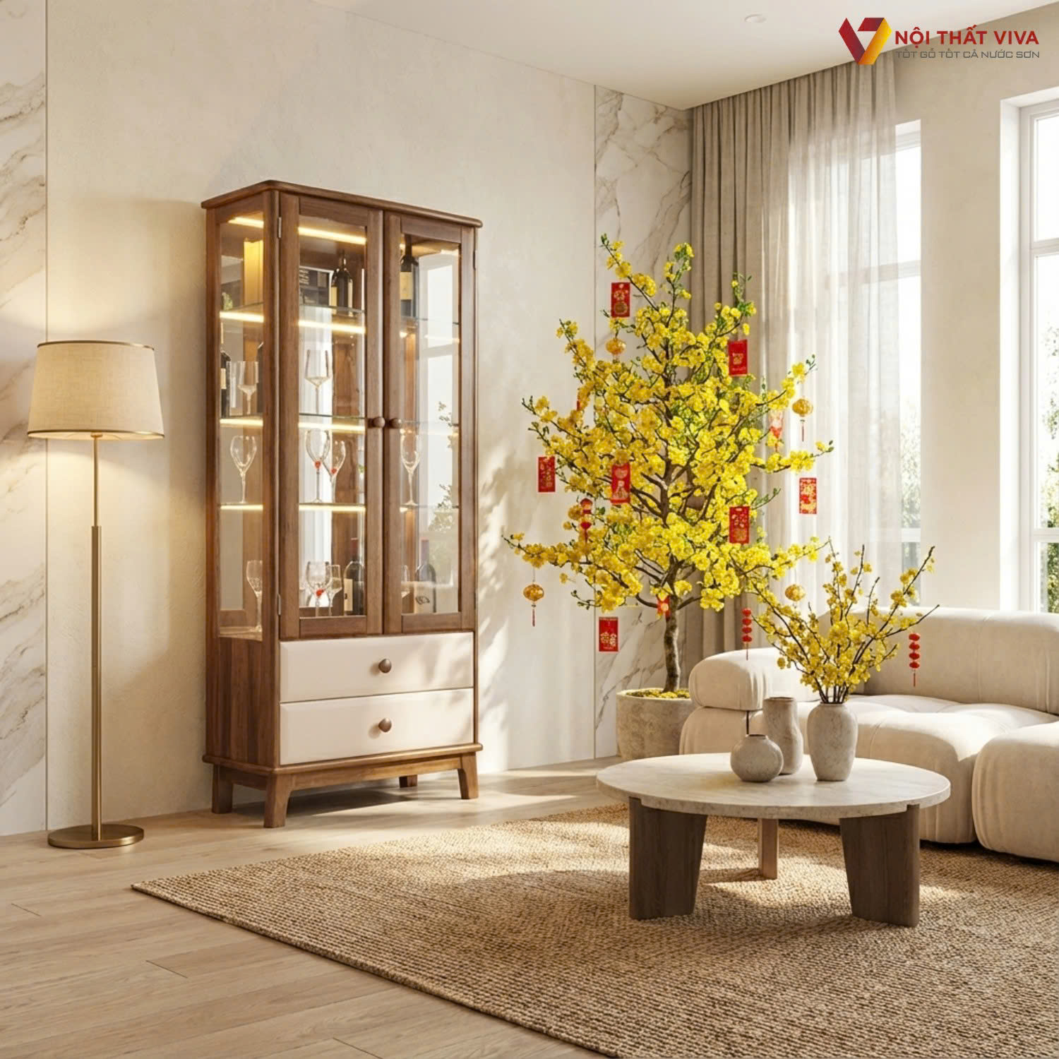 Đây là giải pháp lý tưởng để trưng bày rượu, ly trang trí và tạo điểm nhấn nhẹ nhàng cho phòng khách ngày Tết.