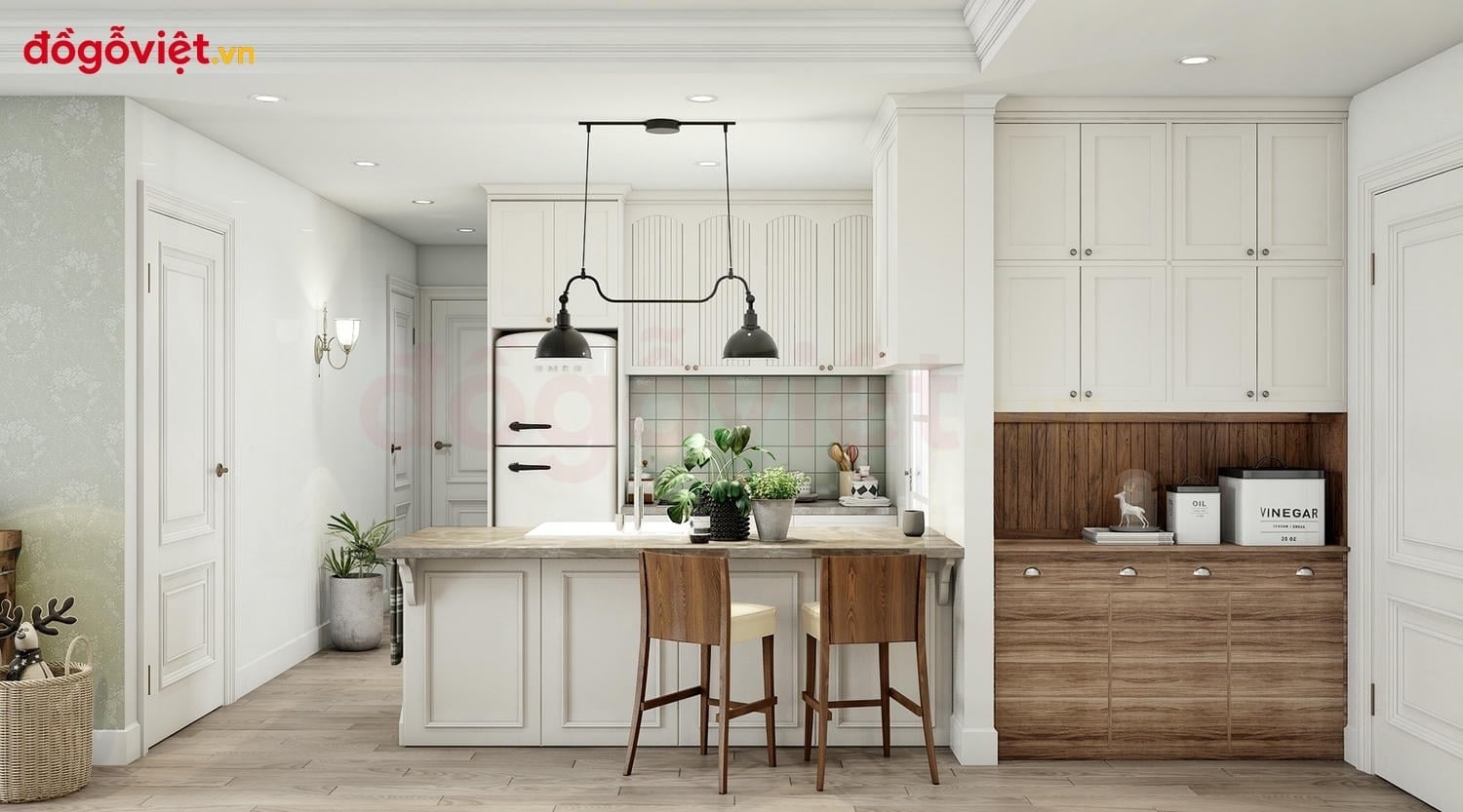 Tủ bếp gỗ màu trắng thời thượng: chi tiết thiết kế & lý do nên chọn