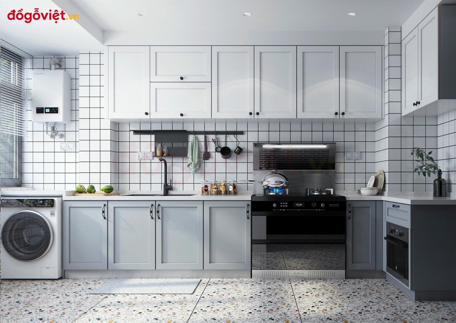Nếu căn phòng bếp có phong cách và màu sắc chủ đạo thiên về màu sáng, màu trung tính. Thì lựa chọn chiếc tủ bếp gỗ màu trắng, sẽ giúp không gian căn phòng thêm phần hài hoà.