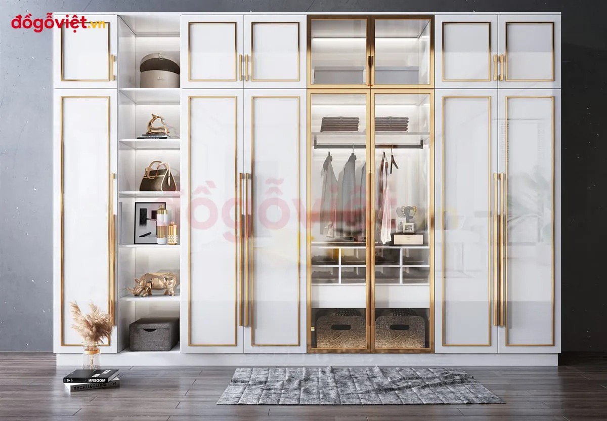Mẫu tủ quần áo này có thiết kế mang đến không gian hiện đại và sang trọng. Kết hợp ánh sáng đèn LED vàng hoặc trắng sẽ tăng thêm sự nổi bật cho túi xách, quần áo,...