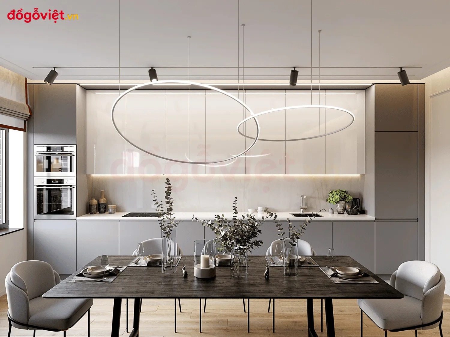 - Nét đẹp hiện đại, sang trọng, thanh lịch: Dễ dàng để bắt gặp sự kết hợp linh hoạt từ các sắc độ màu xám từ màu xám nhạt đến xám đậm. Nhờ đó, tạo được điểm nhấn hình khối hiện đại, tinh tế. Hơn nữa, tông xám đem đến cảm nhận nhẹ nhàng, mang đến mẫu tủ bếp vẻ đẹp sang trọng, thanh lịch và cực kỳ tao nhã.