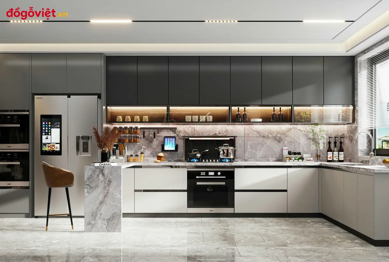 - Mang vẻ đẹp thanh lịch, hiện đại, sang trọng: Tủ bếp màu xám linh hoạt có thể kết hợp từ xám đậm đến nhạt. Vì vậy, tạo được điểm nhấn và sự tinh tế riêng.