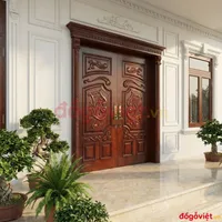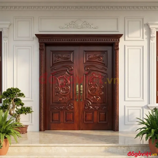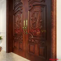 Mẫu Cửa Gỗ 2 Cánh Biệt Thự Sang Trọng Chất Liệu Gỗ Gõ Đỏ Cao Cấp